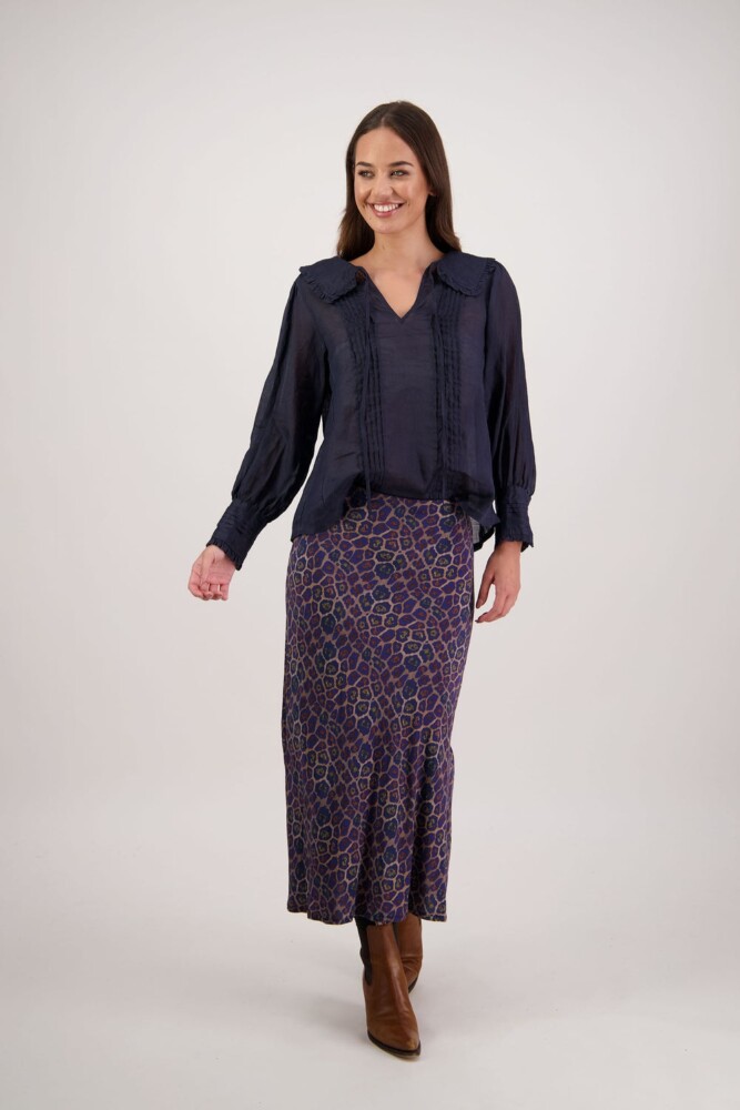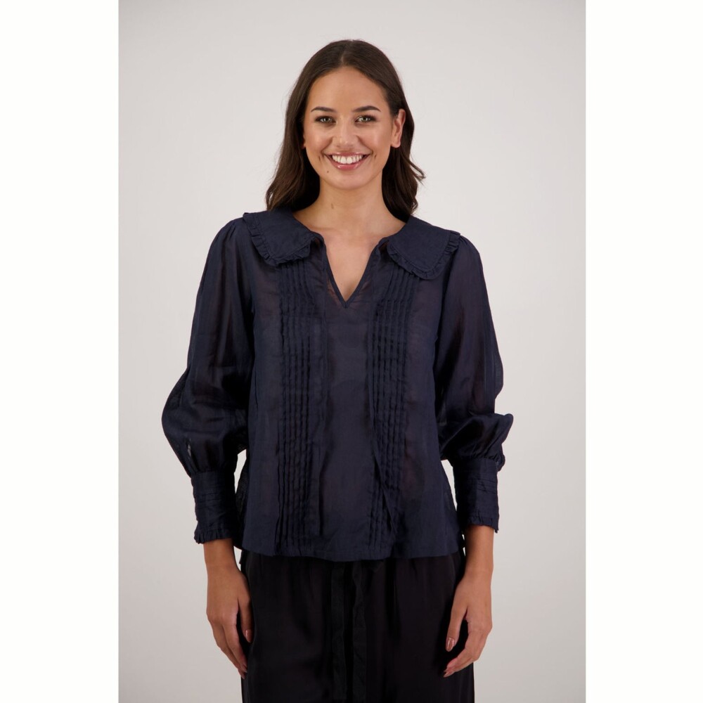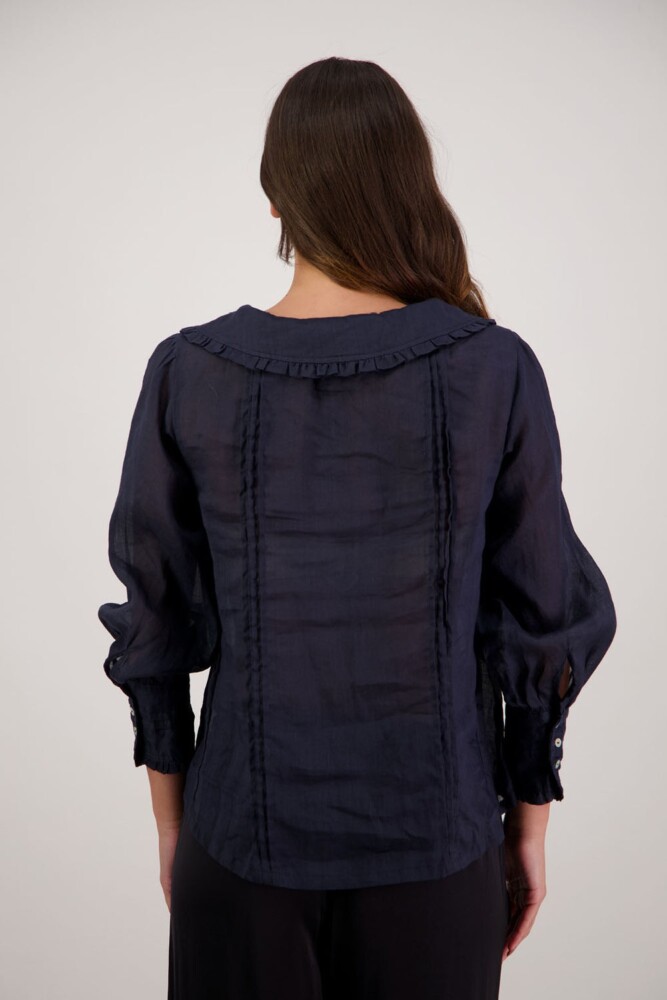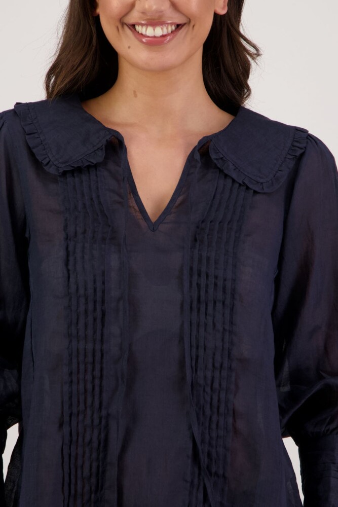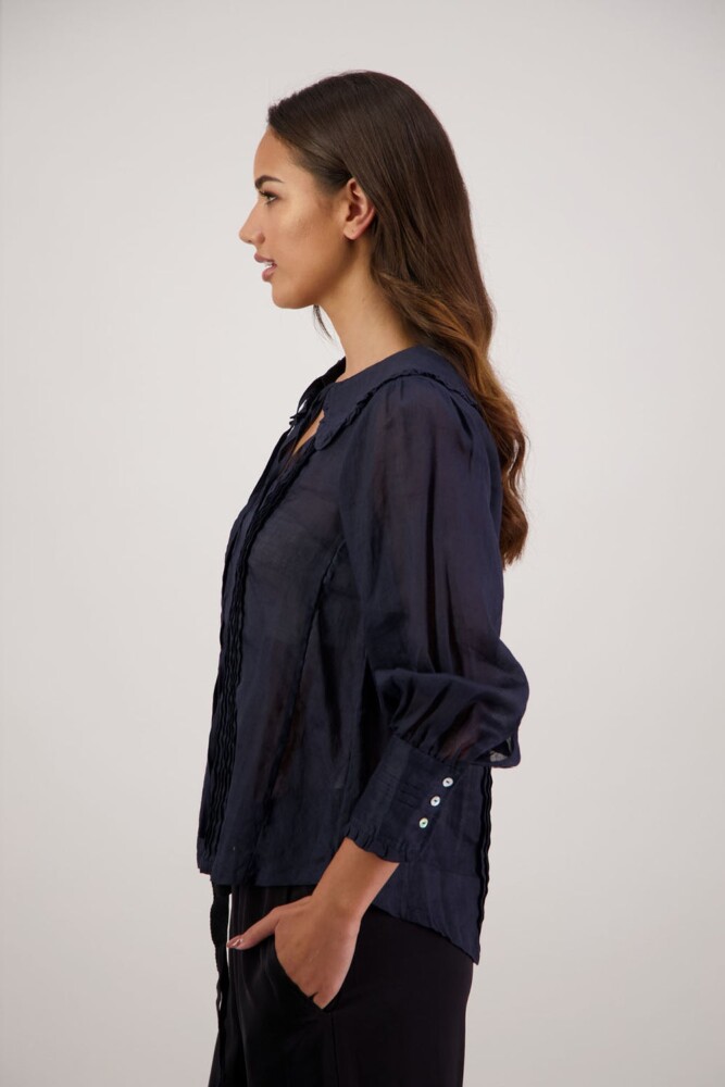 The Richie Shirt is a beautifully detailed style crafted from 100% ramie, offering a lightweight, breathable feel with natural texture. Designed with delicate pintucks through the body, it features a shaped collar finished with soft ruffles and a feminine tie. Full-length sleeves with pintucks and buttoned cuffs complete the look, making Richie an effortlessly elegant piece for everyday or elevated dressing.