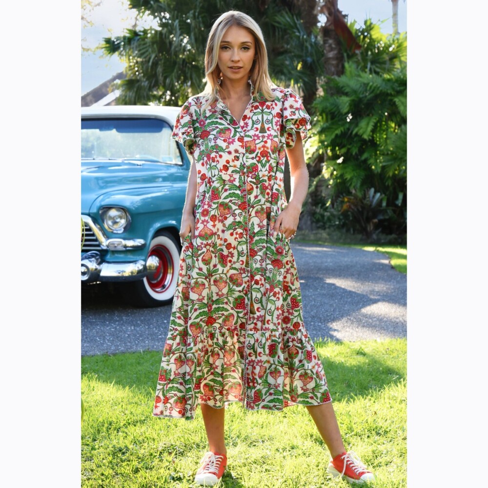 Luxe cotton sateen and a whimsical print come together to present the ‘A Little Flair’ dress. Crafted in the ‘Berry Good’ cotton sateen, this dress sports a button through front, complete with covered buttons, layered flutter sleeves and a gathered hem tier. A delicate embroidered trim polishes this charming dress to perfection.