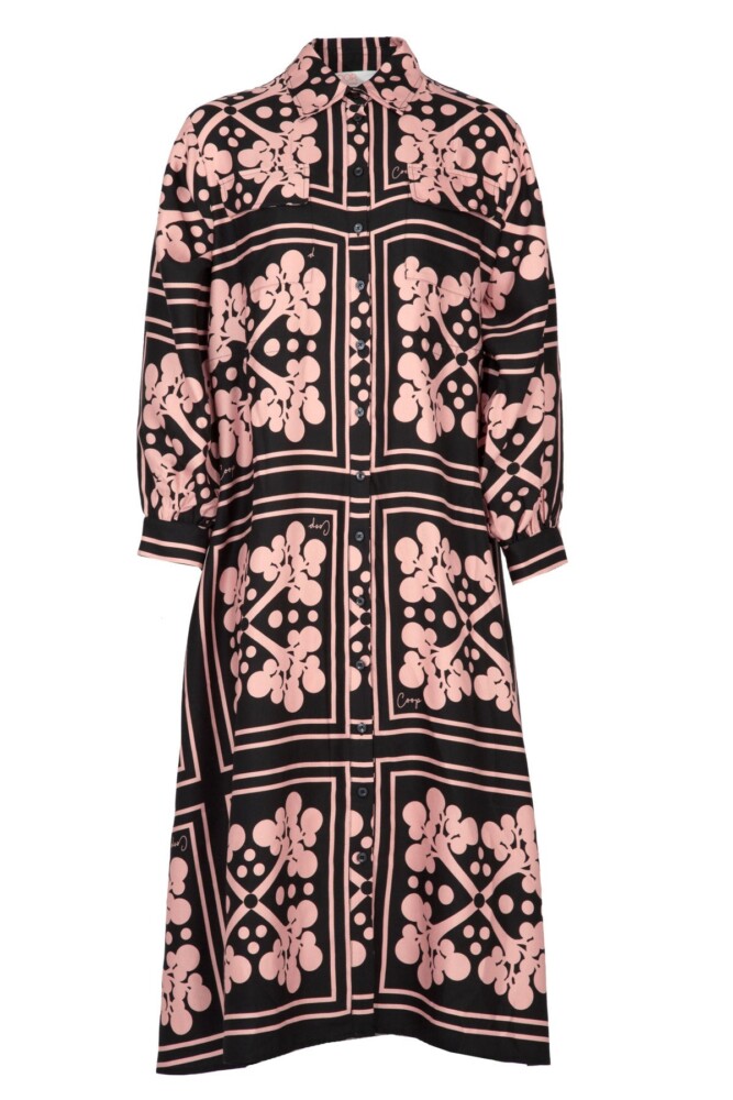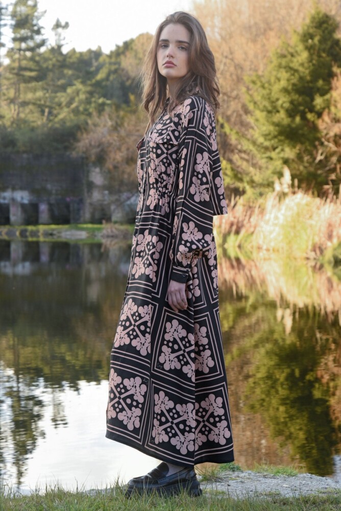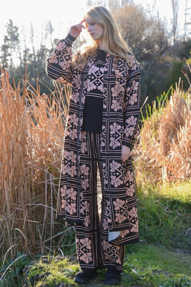 A flowing silhouette meets thoughtful tailoring in the ‘Cinch Forever’ coat dress, crafted in ‘Branching Out’ printed viscose Tencel. Designed as a versatile, multi-use piece, it can be layered as a lightweight coat or worn on its own as a dress. Featuring a button-through front, internal drawstring waist, front patch pockets, and an overlay back panel, it is completed with gathered sleeves and fixed cuffs with button fastening, balancing effortless ease with subtle structure.