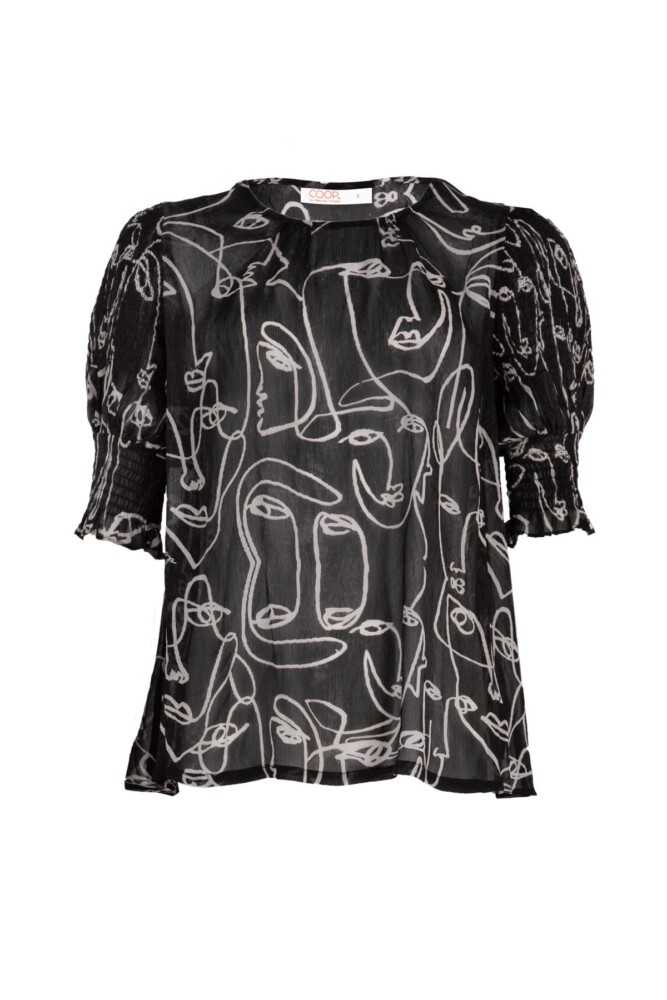 Light, airy, and effortlessly stylish, the semi-sheer ‘Crinkle Crush’ blouse features an eye-catching graphic print that adds a bold pop to any look. Designed with voluminous puff sleeves for a modern romantic touch, it’s the perfect statement piece to dress up jeans or layer over tailored separates. The breathable ‘Face to Face’ sheer fabric moves with you, offering both comfort and standout style from day to night.