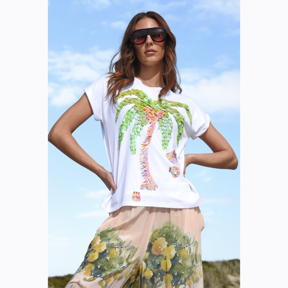 Adorned in eye-catching lustrous sequin and boasting summer with the palm tree motif, the ‘Crown Jewels’ t-shirt is the perfect addition to dress up a casual outfit with ease. Crafted in the ‘Close Knit’ fabrication, this standard fit tee features fixed rolled cuffs, and is detailed with gems amongst the sequins. Style from day to night, the bold print elevates your look with ease.