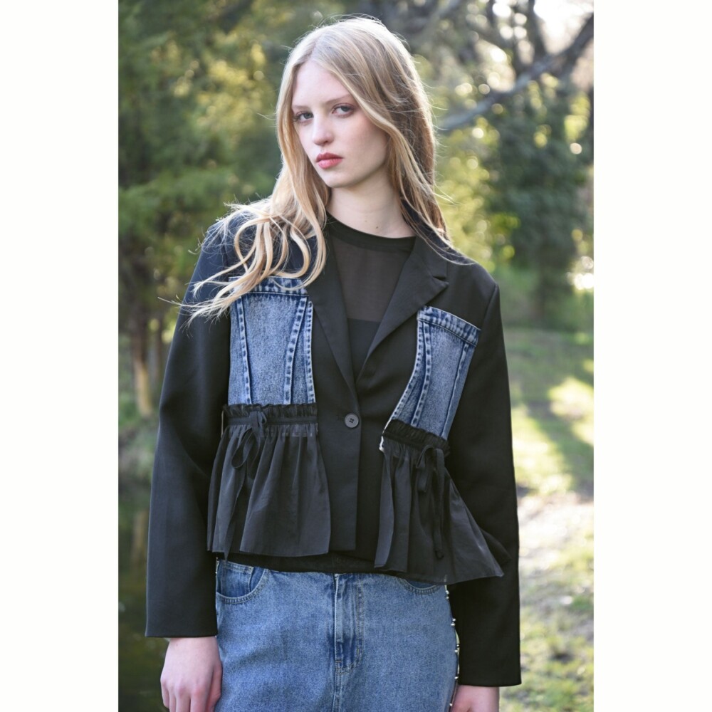 A modern hybrid of blazer and denim, the ‘Denim Noir’ jacket in ‘Jean Scene’ suiting merges structured tailoring with playful detail. Featuring a single-breasted closure, notched lapels, and contrast denim front bodice patches, it’s layered with a gathered sheer overlay finished with a bow embellishment. Fully lined, this fashion-led piece brings edgy sophistication to a classic silhouette.