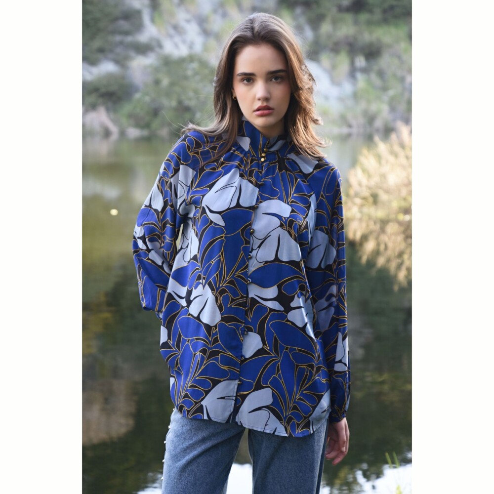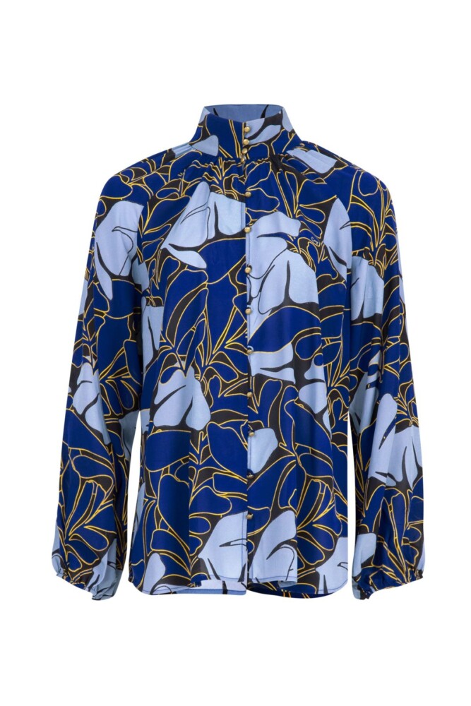 A bold blue abstract floral dances across the ‘High & Mighty’ blouse, crafted in ‘Leaf It to Me’ printed viscose. With a stand collar, delicate rouleau loop buttoning, raglan inset blouson sleeves, and softly elasticated cuffs, it balances expressive artistry with effortless, fashion-led elegance.
