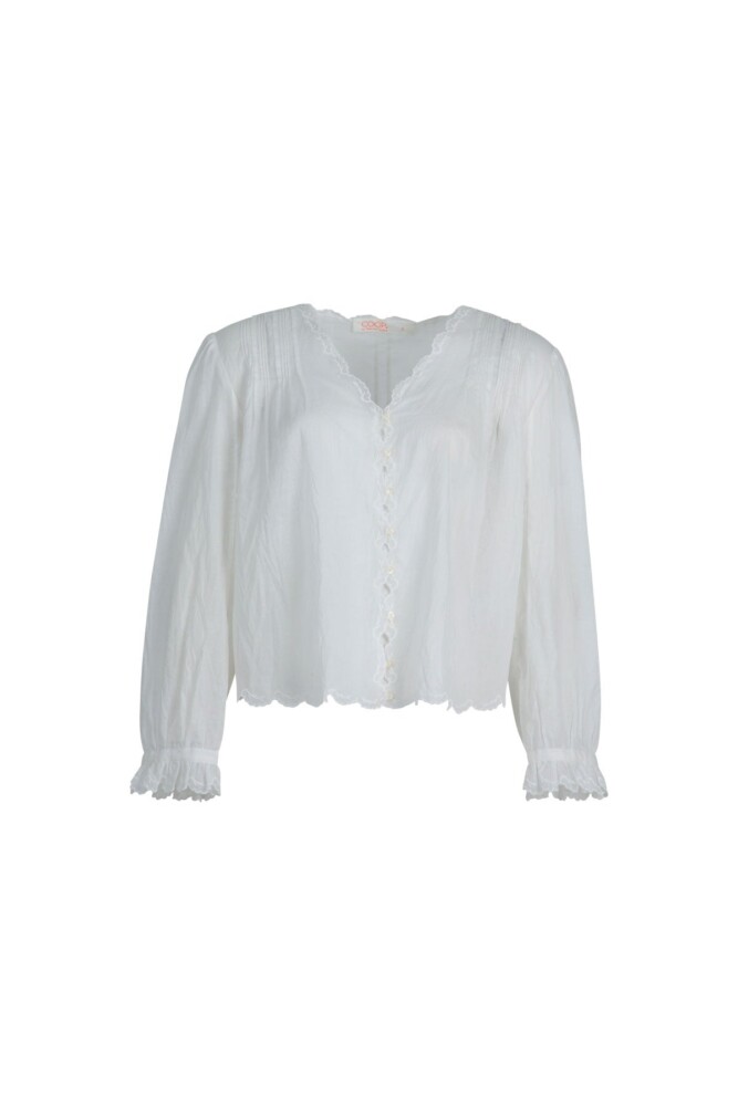 Framed by delicate embroidered edges, the ‘Sew Lovely’ top balances lightness with everyday ease. In semi-sheer ‘Thread Lightly’ cotton voile, it features a button-through front with a flattering V-neckline and a tie-back detail that adds a softly feminine finish.