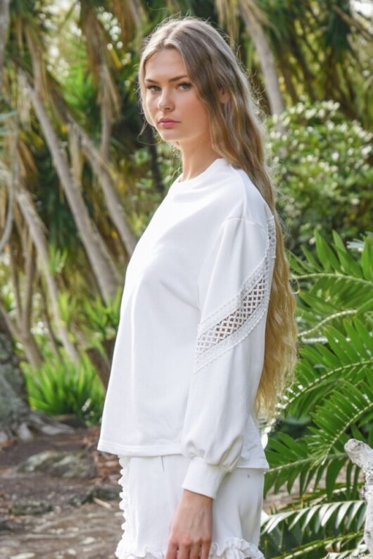 Promoting sport-luxe, the ‘Sweater than Honey’ sweatshirt grants comfort and style for weekend lounging. Crafted in the ‘No Sweat’ cotton sweatshirting, this piece sports a relaxed fit through the body with generous sleeves secured with a ribbed cuff. With a contrasting poplin back and embroidered lattice lace inserts this sweatshirt is designed with style and comfort at the forefront.