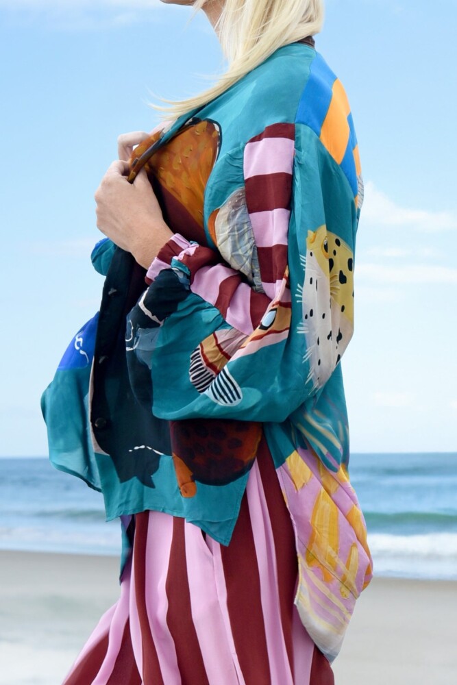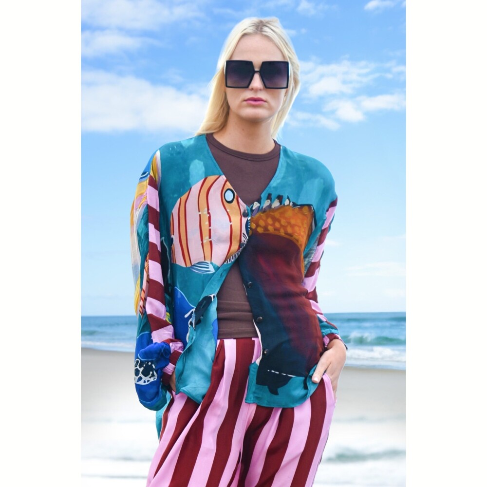 This season’s must-have fabrication ‘Ocean Wonderland,’ featured on the visually striking ‘As you Like it’ shirt, you’ll want in your wardrobe. Featuring a classic button through front and V-neckline, it offers rouched panel sleeves, high-low hem and side split detailing. Style it with the complementary ‘Feeling Leg-endary’ pant with flats for a day in the sun or dress up with heels for evening plans.