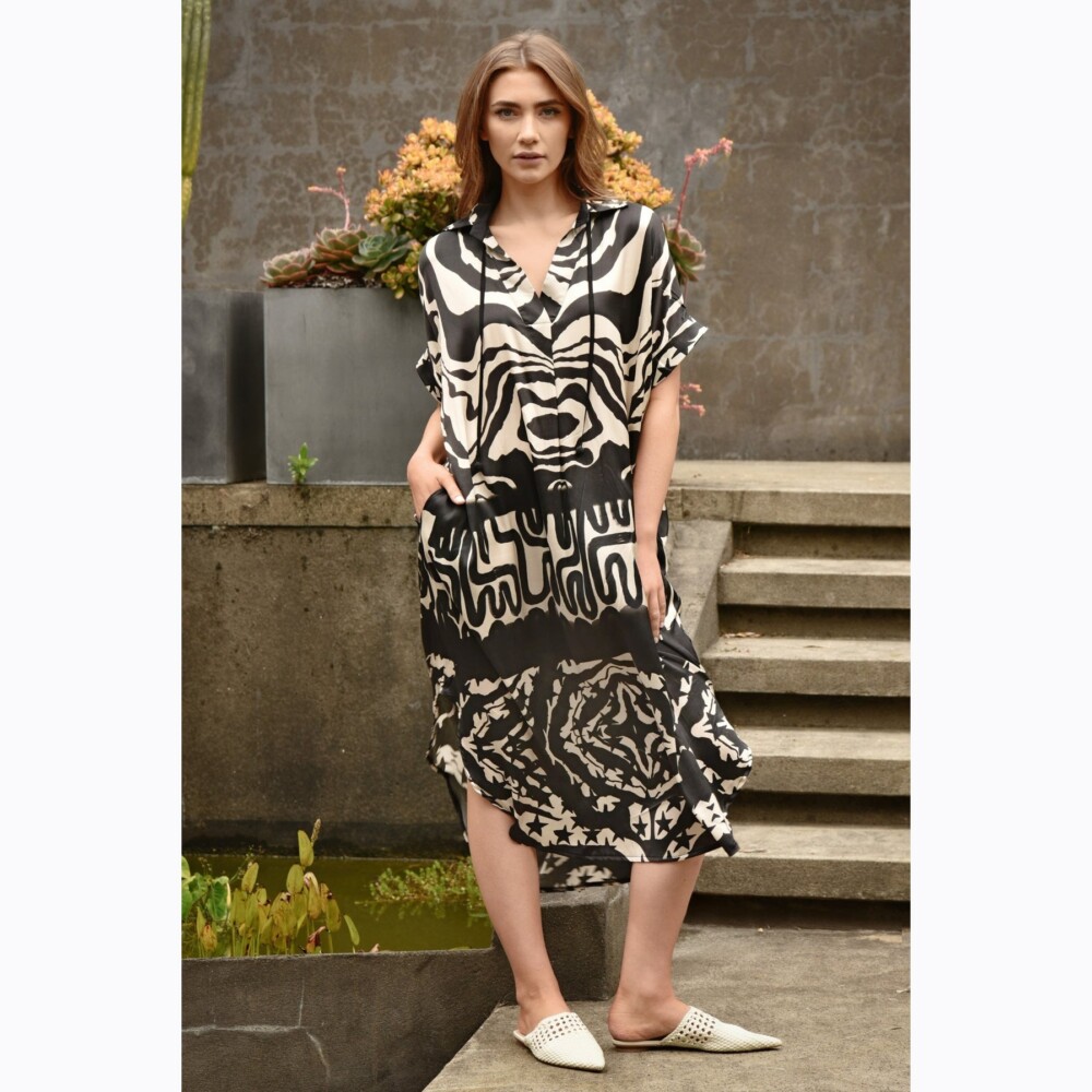 Comfort is key with the ‘Here & Now’ dress. Crafted in the luxe hand-feel ‘Written in the Stars’ tencel, this dress sports a relaxed fit through the body with drop shoulders, V-neckline and collar. Complete with beaded tassel tie, this kaftan style dress is perfect for holidays when light packing is essential.