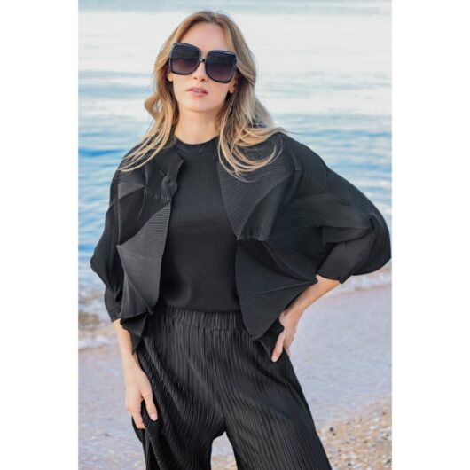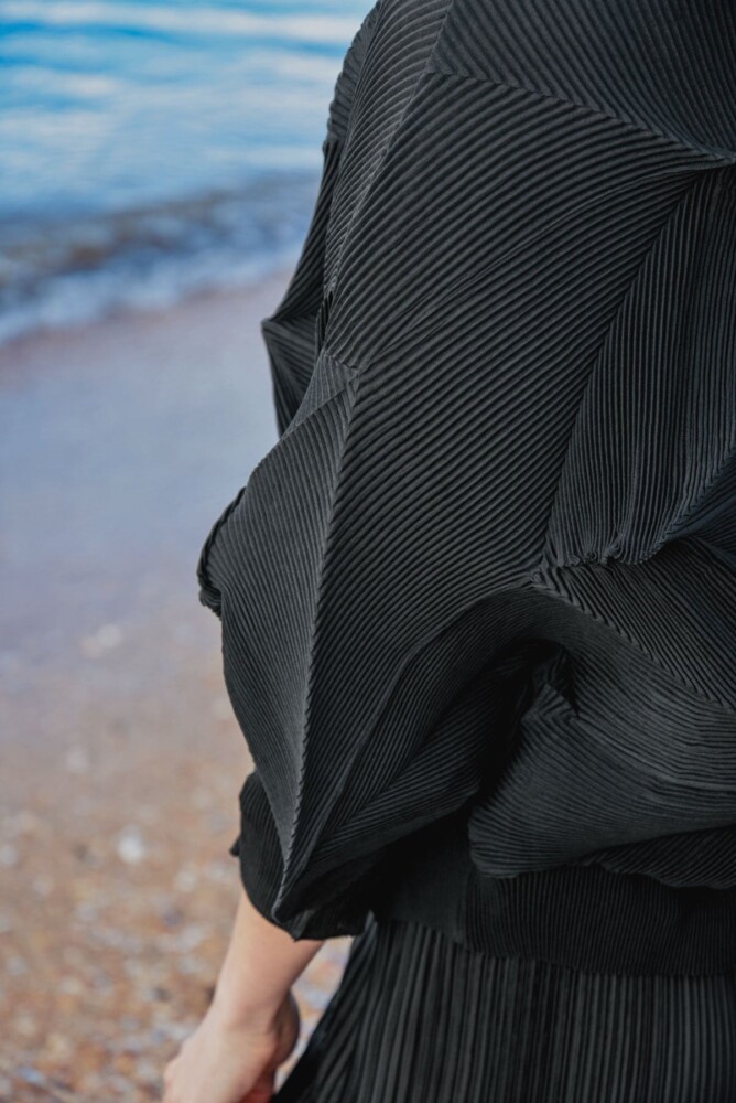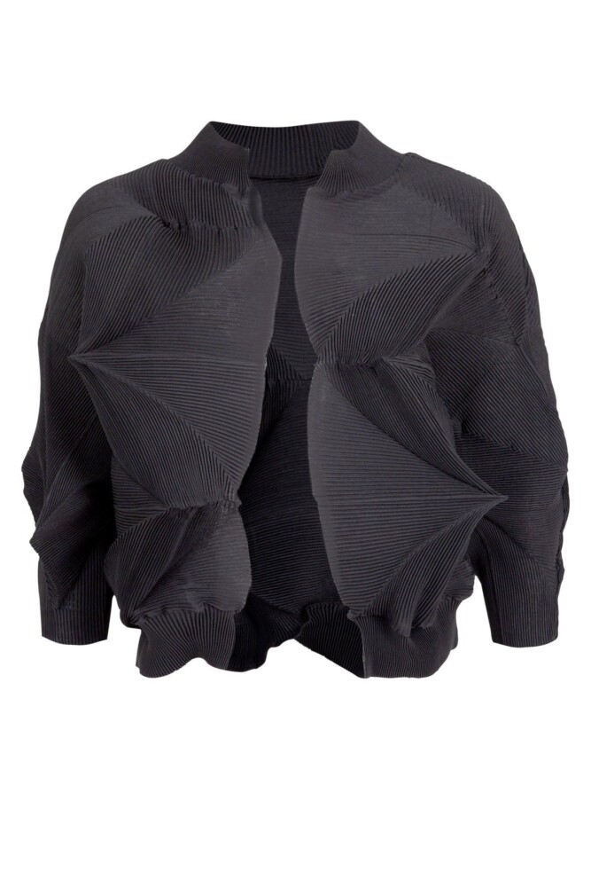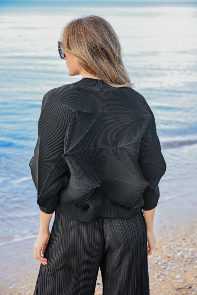 Harmoniously balancing structure and drape, the ‘Arts and Crafts’ jacket is designed intelligently to add an architectural element to your everyday wardrobe. Crafted in the soft ‘Feel the Rush’ plissé pleated fabric, this jacket is cut uniquely to peak and drape without added seams. Perfect for layering over dresses as a light layer or pair with the ‘Weekend Kicks’ pant for a full pleated moment.