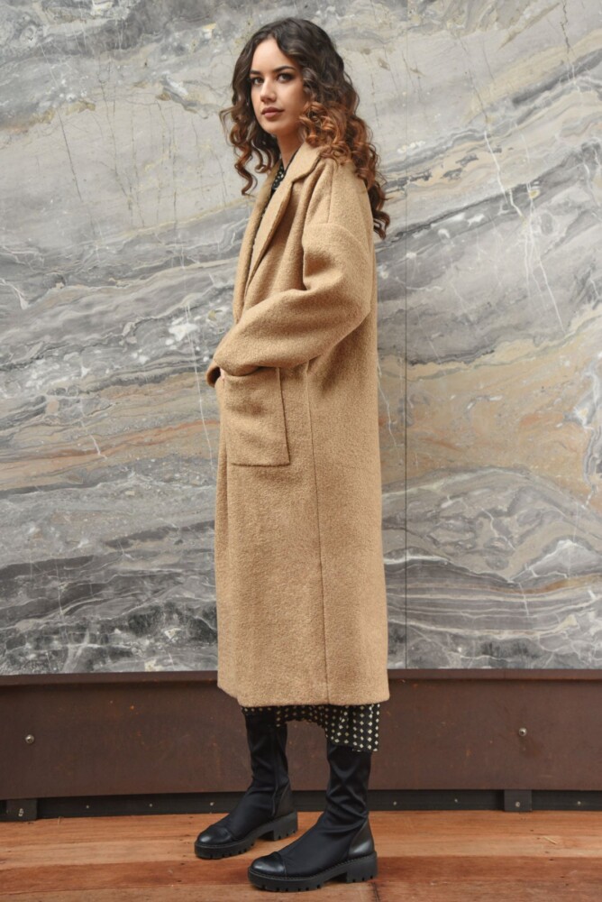 Step into effortless comfort with the ‘Coming Up Cozy’ coat. Draped in soft, textured ‘Warm Front’ bouclé, its relaxed fit and drop shoulders invite a cozy, laid-back silhouette. A single button closure and notched lapels add a touch of classic tailoring, while patch pockets keep it charmingly practical. Unlined for an easy, breezy feel, this coat is your go-to layer for cool days with a warm heart.