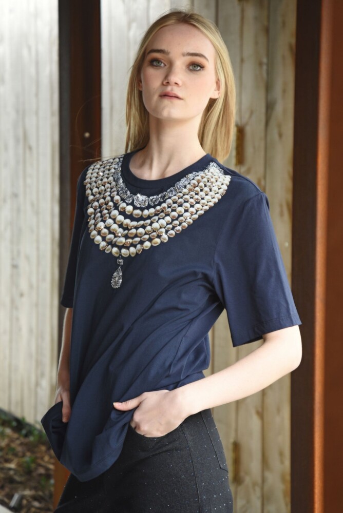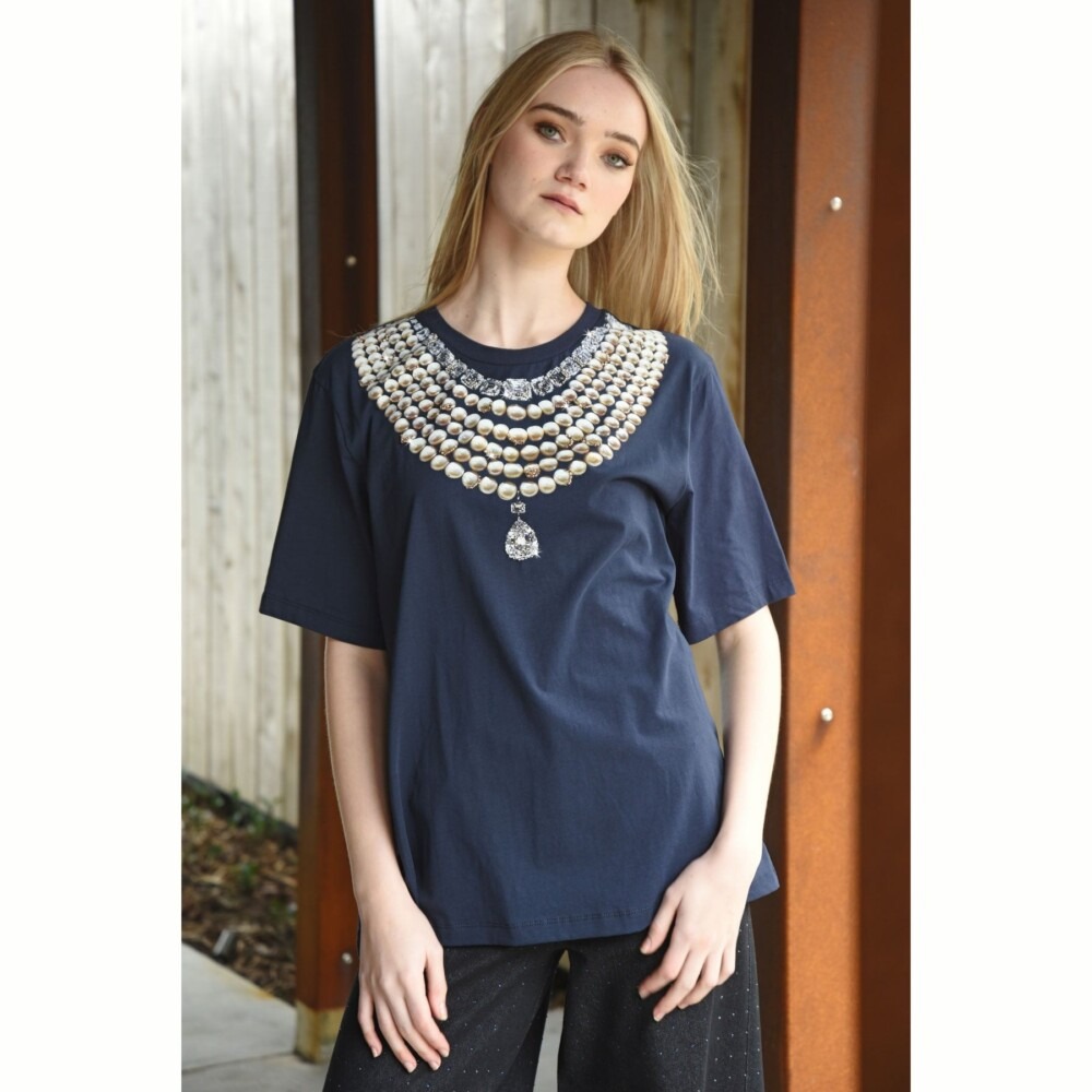 Let your style shine with the ‘Dazzling Dream’ top, crafted in our comfortable ‘Charmed to Meet You’ cotton spandex blend. Designed in a relaxed fit for effortless wear, it features a playful pearl-necklace print brought to life with delicate bead embellishment. Easy, charming, and delightfully eye-catching, this is the piece that turns every day into a little moment of sparkle.