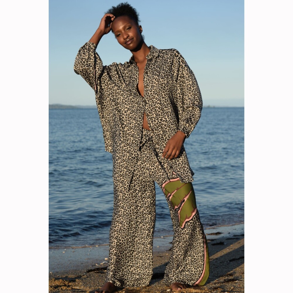 Silky satin and a streamlined silhouette present the ‘Take Your Lead’ dress. With fluid drape, granted by the ‘Spot off the Press’ viscose satin, these pants show off a bold animal print complete with a palm graphic outlined with a contrasting cord embellishment. With a generous wide leg and elasticated waistband, these trousers do not skimp on comfort or style!