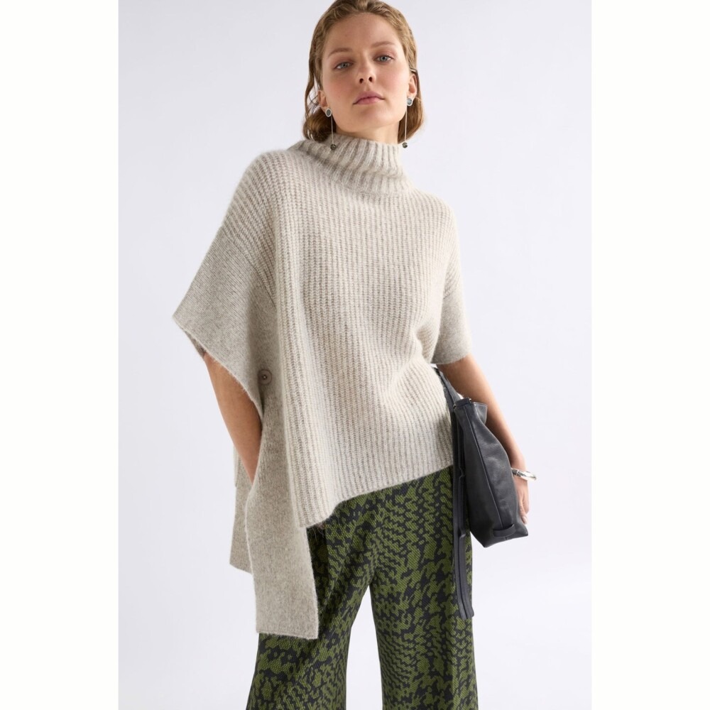 The Aleph Poncho is a boxy turtleneck style crafted from a luxuriously soft blend of merino wool, alpaca and recycled nylon, in a two-tone mix of oat and flax coloured yarns. This ribbed knit, poncho-style silhouette features a high turtleneck collar, open sides with extended shoulder panels, and arm openings. A single button detail at the side seam allows for flexibility in shape and styling, while the high-low hem adds interest. A statement layering piece for cooler weather. Wear over our fine merino knit basics or neater fit knits.