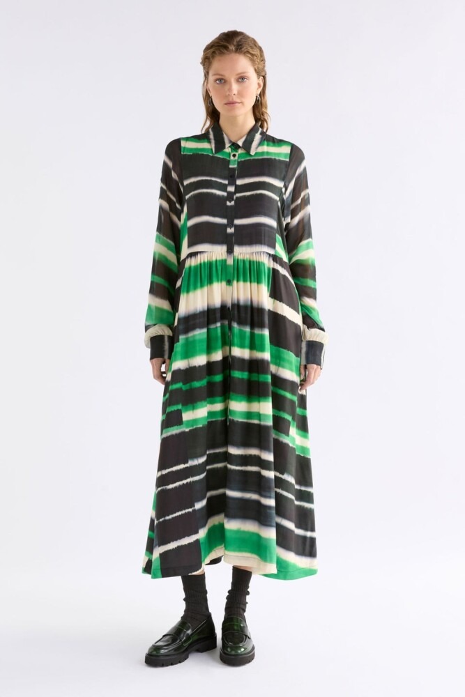 Make a statement in the Ines Dress, this midi-length, long sleeve shirt dress will add a striking pop of colour to your wardrobe with the vibrant and bold, tie-dye-look, Saillte Print of ink and verdant green. This regular fit dress has a classic shirt collar with button-through placket and features an opaque body with sheer long sleeves for a subtle refined contrast. The waist seam with gathers at the front and back creates gentle volume flowing into a full skirt. This playful dress will take you from day events and into the evening with a simple change of accessories. Pair with heeled boots and metallic silver jewellery for day-to-evening looks.