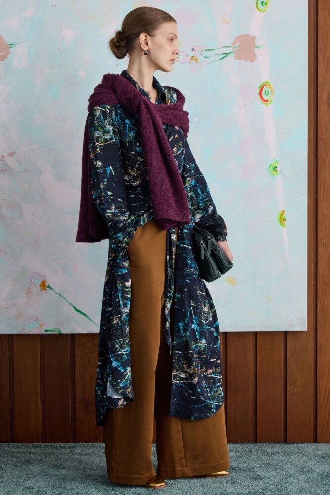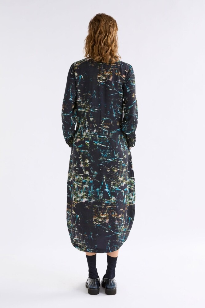The Kallio Dress is a midi to long shirt dress in the striking Norda Print, inspired by the Northern Lights, crafted from a silky LENZING ECOVERO™ viscose blend. This regular fit dress features a tie front detail at the waist that wraps to tie at the front or back. Finished with a classic collar, button-through placket, and full-length cuffed sleeves with elastic loop button closure. A curved hemline with side slits complete the design. The versatile wrap-tie waist allows customisation of the look and silhouette. Pair with boots or flats for autumn-winter layering.