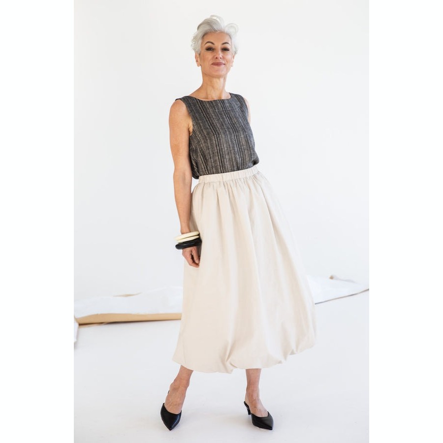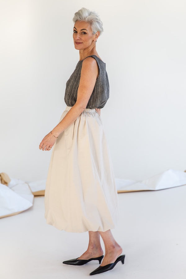 The midi-length skirt features a voluminous silhouette that is gently gathered to create a bubble hem. Fully lined and featuring an elasticated waistband with side seam pockets, the Ziggy is a modern yet practical statement piece.
