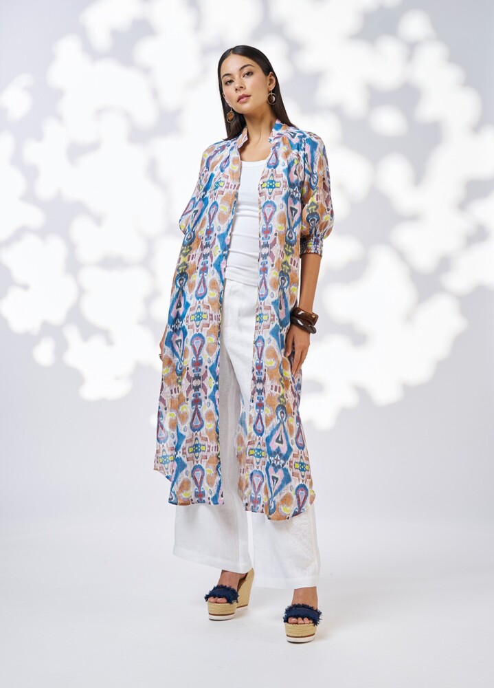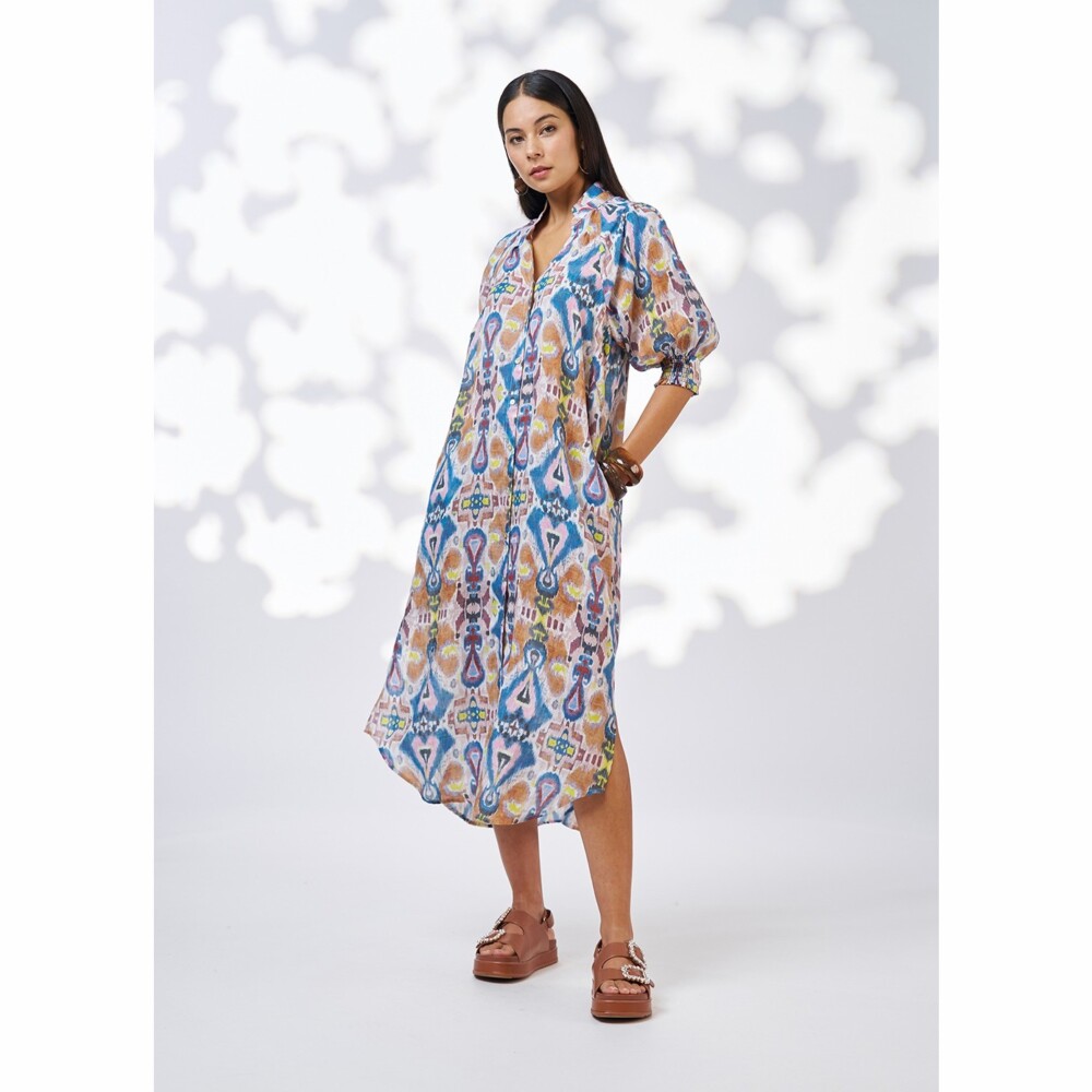 Printed shirt dress with a flattering collared neckline with tucks to create a V neck. Sleeves gather into half shirred cuffs, with side splits & in-seam pockets.