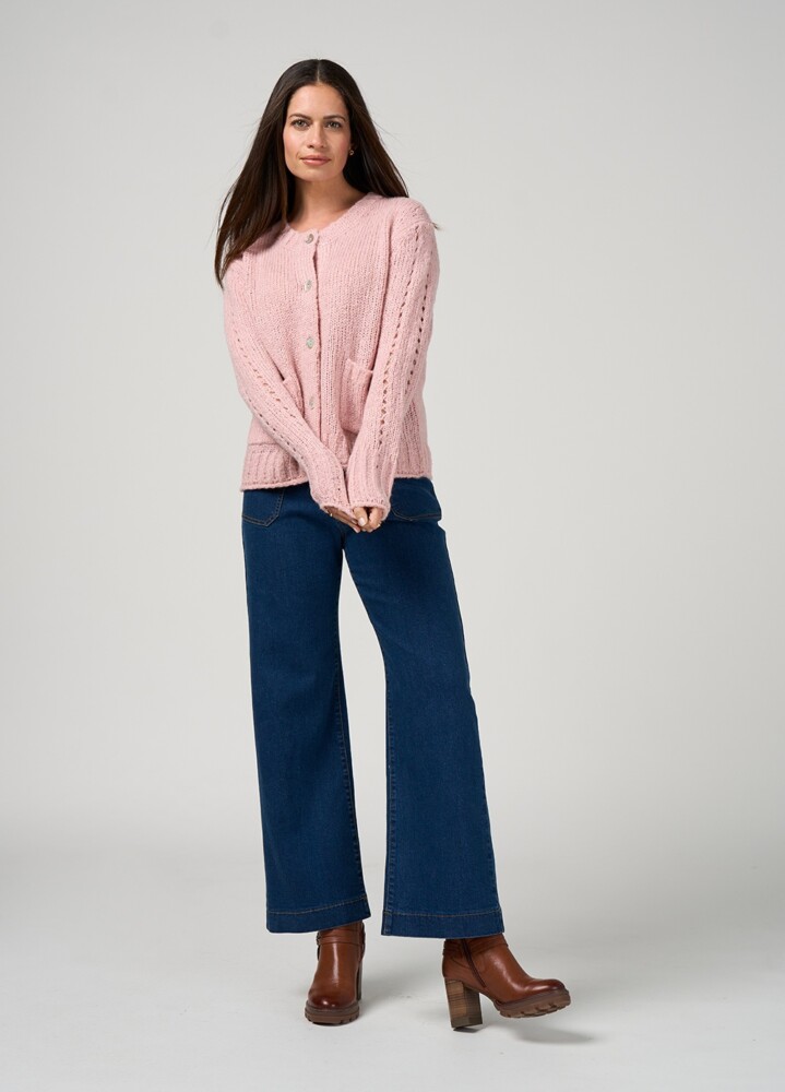 Relaxed-fit crew neck cardigan in a soft wool blend, featuring delicate pointelle detailing on the centre back and sleeves, with front pockets and finished with classic shell buttons.