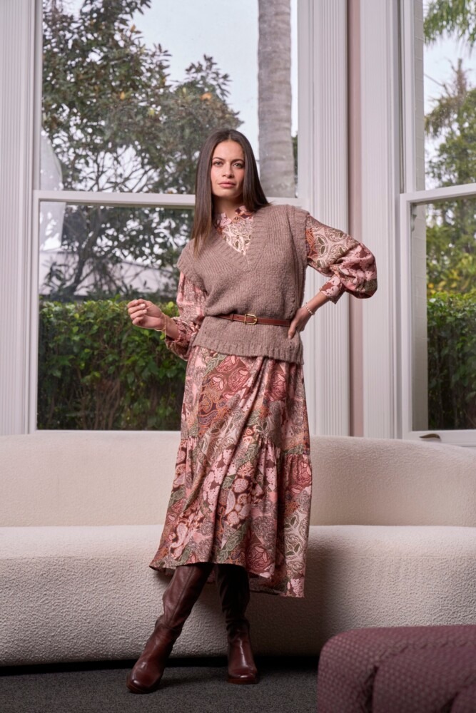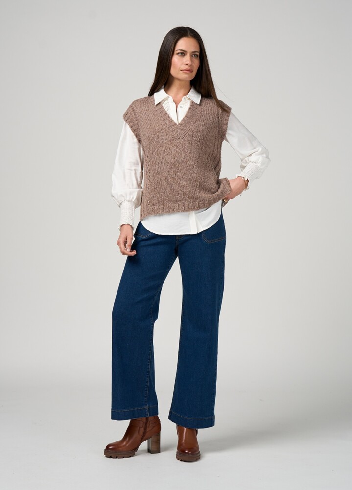 Knit vest in a soft wool blend, featuring rib and pointelle detailing at the sides with cut-away splits for easy layering.