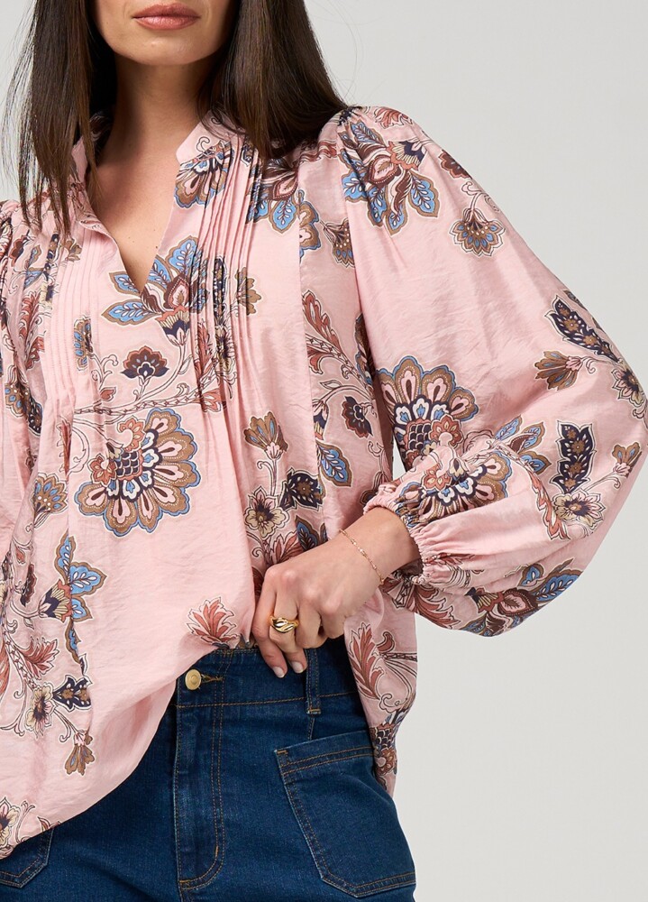 Floaty feminine blouse featuring a keyhole neckline with a hook-and-eye closure, featuring delicate front pintucks, and narrow elasticated cuffs for a soft, elegant finish.