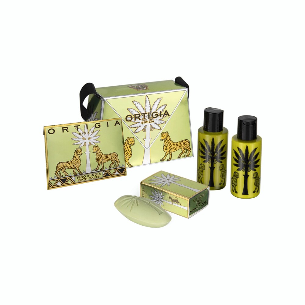 Brightly coloured bags with leopard print interior, containing Ortigia’s natural scented products in miniature, suitable for gifts or travel. Italian style meets the history and magic of Sicily.
