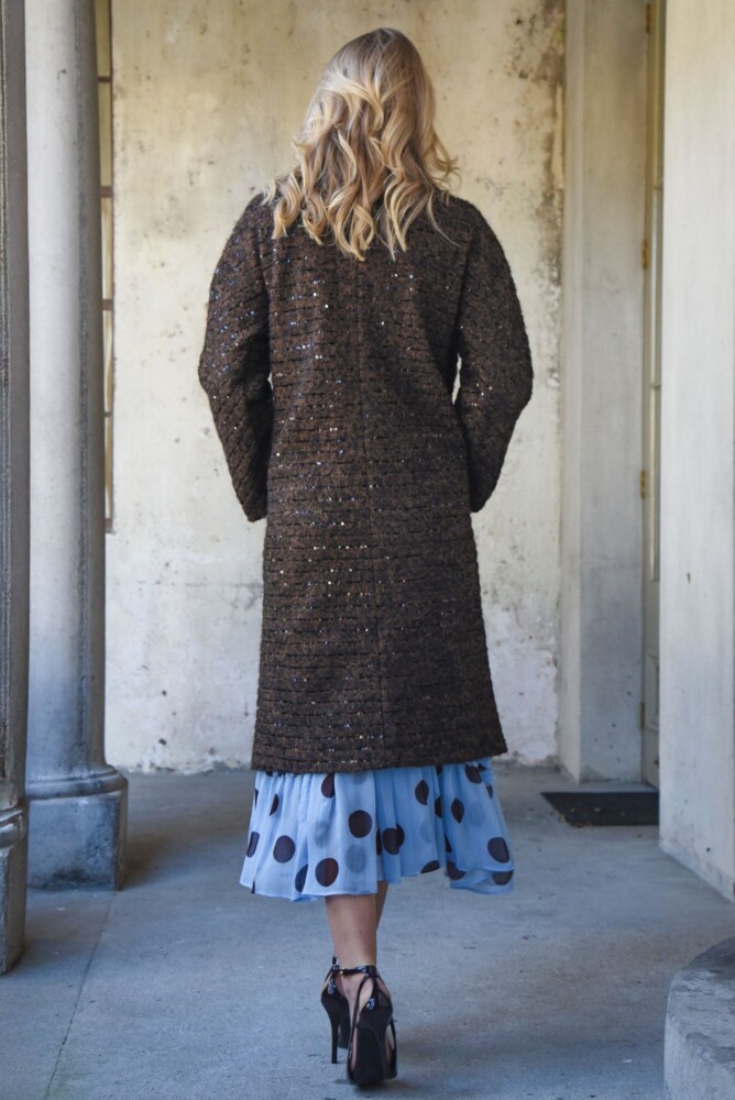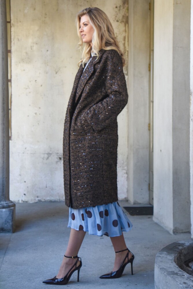 Sequin threaded ‘Sprinkle of Sparkle’ coating brings a refined glimmer to the ‘Warm This Way’ coat. Designed with a double-breasted closure and classic notched lapels, it features sculptural cocoon sleeves, practical side pockets and bound internal seams. Unlined for effortless layering, it delivers understated sparkle with a modern, fashion-led edge.