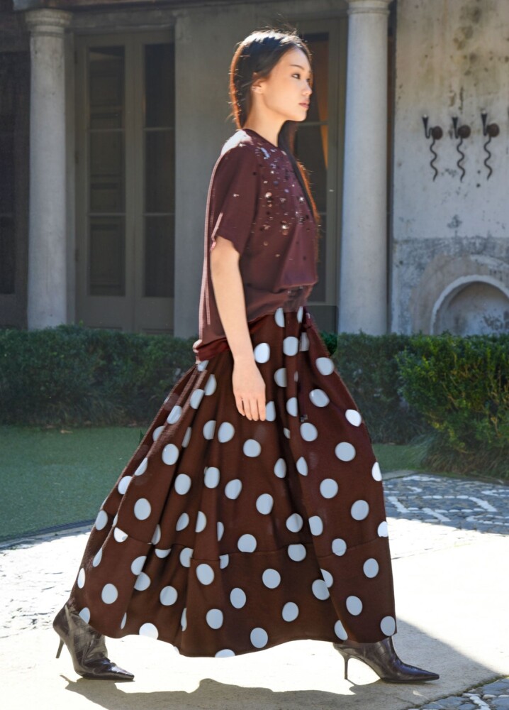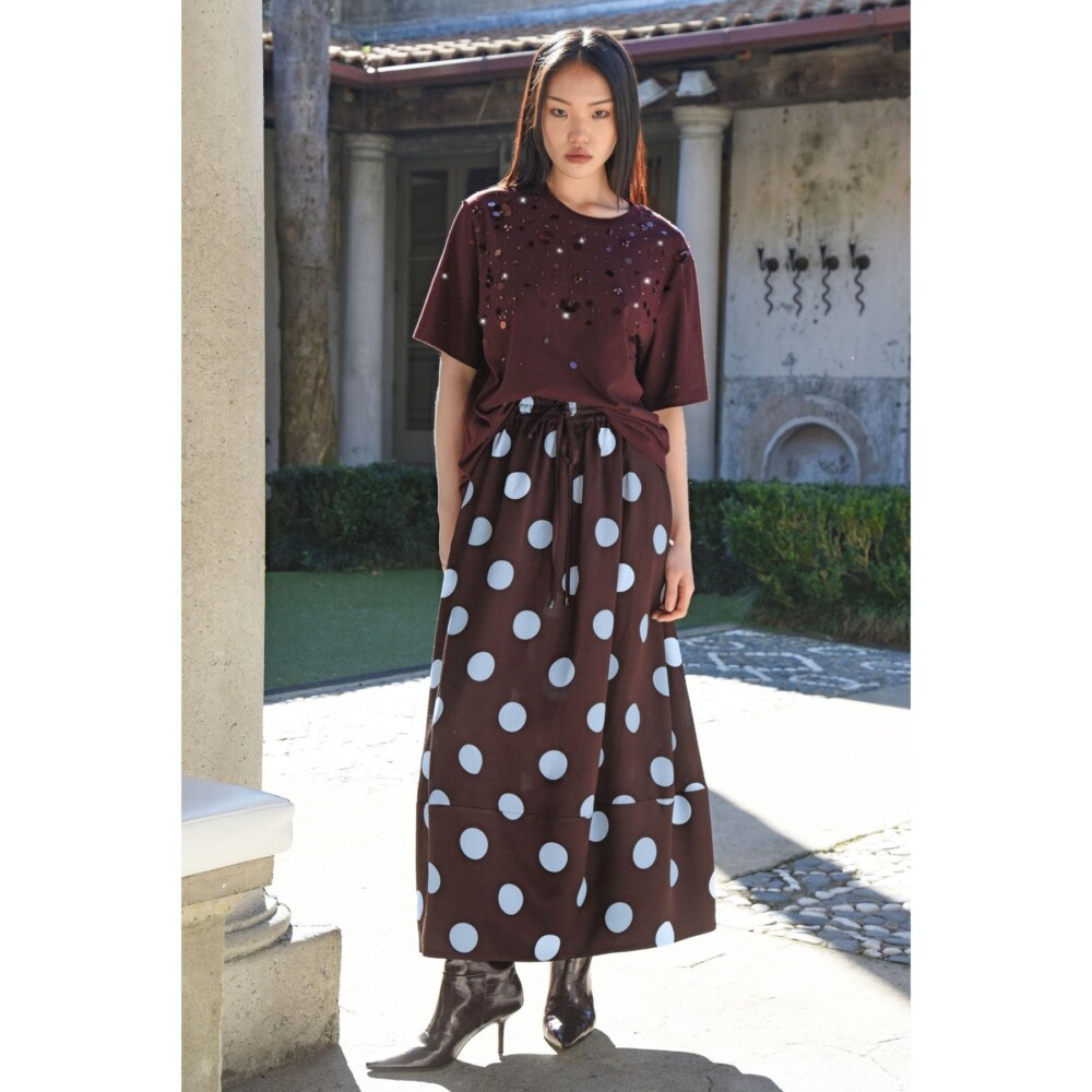 Sculptural elegance defines the ‘Hot Air Balloon’ skirt in ‘Spot Chocolate’ viscose blend twill, offering volume with a soft, enveloping cocoon shape. An elasticated drawstring waist ensures a comfortable fit, while side pockets add practicality. Finished with a deep hem panel and unlined for light, effortless wear.
